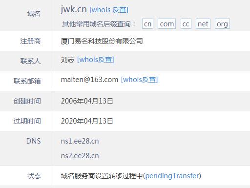 查詢發(fā)現(xiàn)jwk.cn注冊于2006年4月,至今已有將近13年的時間,從含義上看,jwk.cn有“幾萬塊、教務(wù)科、街舞課”等含義,簡短好記且便于輸入,在應(yīng)用上適用于醫(yī)療、食品、教育、社交、健康產(chǎn)業(yè)等行業(yè),具有很高的投資價值和商業(yè)應(yīng)用價值。