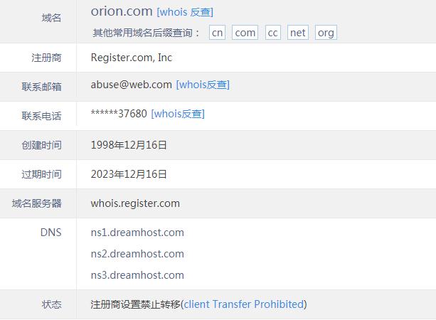 查詢whois發(fā)現(xiàn),域名Orion.com注冊(cè)于1998年12月,距今已有21年歷史,是一枚很典型的英文單詞米,直譯是“獵戶座”的意思,對(duì)應(yīng)有國(guó)外幾家以“Orion”的終端企業(yè)。據(jù)外媒稱,域名Orion.com此前一直處于隱私保護(hù)中,在6月26日有過(guò)更新。目前訪問(wèn)Orion.com,已跳轉(zhuǎn)至Orion Advisor Solutions官網(wǎng)orionadvisor.com。