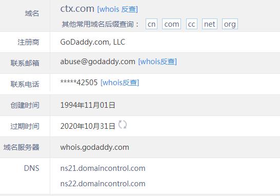 查詢whois發現,域名CTX.com注冊于1994年11月,距今已有25年歷史。作為三字母域名,CTX.com外形短小精悍,品相較好,簡短好記、好輸入,在市場上備受投資人和終端青睞;含義上,對應有“高技術中心”、“計算機用戶電報交換機”等詞的首字母縮寫,在中文里有“長筒靴、車天下、春天下”等含義,適合鞋類、汽車等領域建站啟用。目前與之對應的有保險終端CTX Special Risks Limited,官網啟用域名ctx-risks.com。