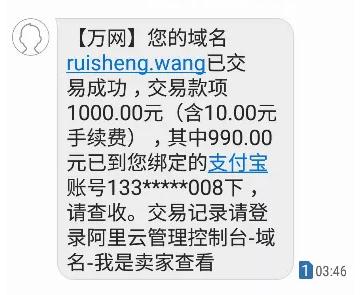今日,米友1號網(yihao.wang)在QQ群發了一張截圖,他的域名ruisheng.wang以1000元成交!