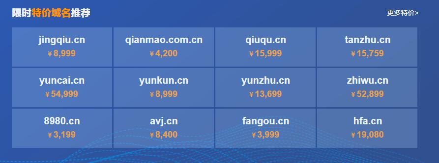 打開首頁就能看見,點擊更多可以查看全部【限時特價域名】推薦,以遠低于原價的價格購買其中的優質域名。為與正常價格銷售域名做區分,每個【限時特價域名】都會在右側帶有閃電的標志,鼠標移上去會有特價剩余時間提示,限時特價時間為1-7天不等,時間一到立即恢復原價,歡迎大家關注。