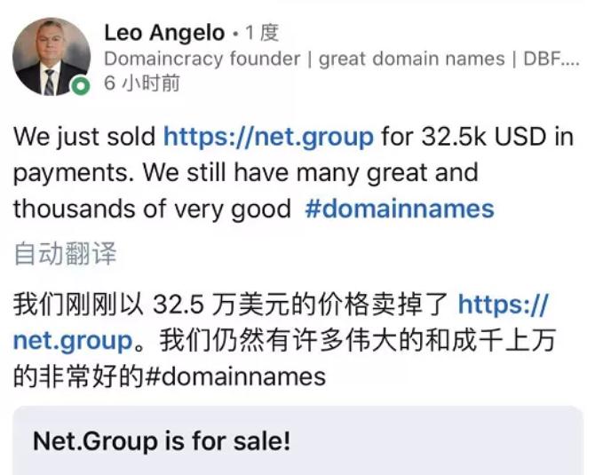 近日,單詞域名net.group以32.5萬美元售出,約合人民幣207萬元!