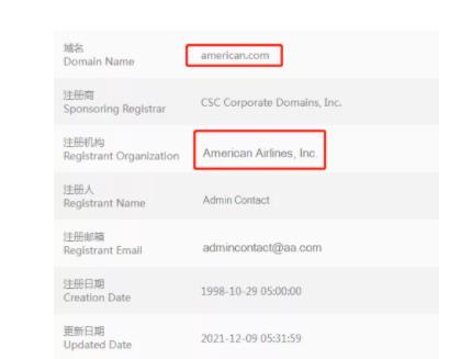 買家美國航空(American Airlines)作為寰宇一家的創始成員之一,是世界最大的航空公司,目前市值達到了110.8億美元。目前American.com 從企業注冊商 MarkMonitor 轉移到另一個企業注冊商 CSC,并立即將美國航空公司顯示為注冊人(CSC 是美國航空公司的首選注冊商)。目前美國航空的官網使用極品兩字母域名AA.com,是美國航空在1997年收購的,也成為了第一家收購兩字母.com域名的航空公司。此外,美國航空的中國官網域名使用Americanairlines.cn,同時原域名Americanairlines.com也可以跳轉到AA.com。美國航空一共持有aatravel.com、aamos.com、TWA.com、aapilots.com等在內的一百多個品牌相關域名。