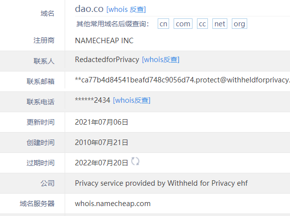 查詢whois發(fā)現(xiàn),域名DAO.co注冊(cè)于2010年7月,距今已有12年的歷史,從中文含義來看,其有““到、道、刀”的意思,域名還是區(qū)塊鏈里面的一個(gè)專業(yè)術(shù)語“去中心化自治組織”(Decentralized Autonomous Organization)的縮寫。.co是哥倫比亞共和國的國家頂級(jí)域名,擁有“Corporation、Company"(商業(yè)公司)”等含義,因此易獲得終端和投資人的青睞和認(rèn)可。