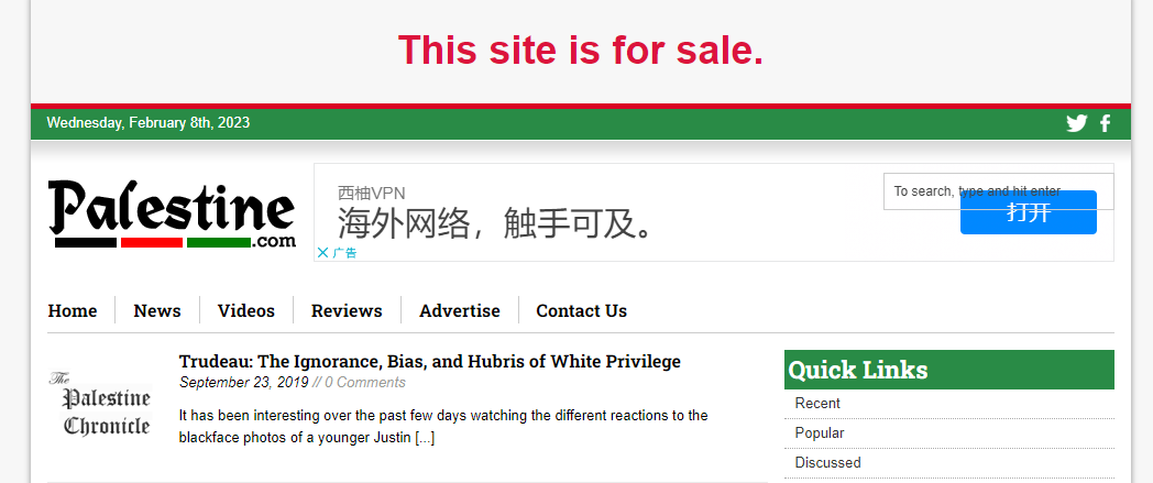 據了解,域名Palestine.com原來是記錄巴勒斯坦相關資訊新聞的網站,目前訪問該域名,仍能看到該網站上方標注的“This site is for sale.(此網站正在出售)”。